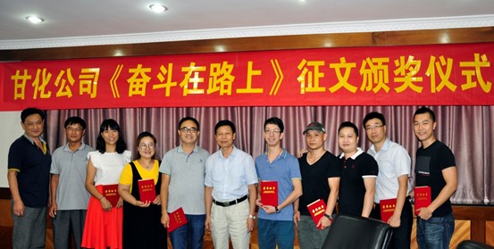 2018年8月17日下午,在甘化大厦15楼会议室,公司党委、工会举办《奋斗在路上》获奖征文颁奖仪式。本次活动共收到征文11篇,参赛征文经专业评委评选,获奖10篇。公司各支部委员、工会委员和征文作者共16人参加了会议。