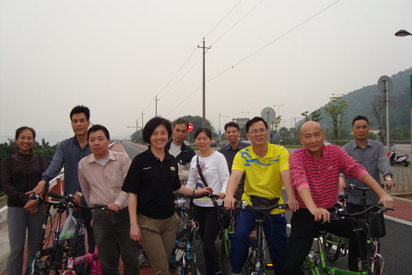 经过大约半小时的路程,我们来到了滨江绿道租车处,精心挑选了自己喜欢的自行车,迫不及待地骑上试试。绿道上,我们欢笑着排成一排,合照留影。只等小组长发出“出发”的命令。“走”,在小组长的发号声中,一辆辆自行车像离弦的箭一样向前飞驰。我们奔驰在宽阔的绿道上,你追我赶,享受着大自然的美丽,洒下一路的欢声笑语。雨后潮湿的路面并没有减弱我们的激情,相反雨后的清新反而给我们带来了别样的风景和舒畅的心情。绿道旁边的公园在雨后显得特别有生气,一排排的花草树木在我们面前掠过。一阵风吹来,树叶发出“沙沙”的响声,仿佛唱着一首首轻快的歌,欢迎我们的到来,让我们领略了绿道散发出的迷人魅力。车队驻足于此,“快门”记录了我们迷人的微笑和绿道的文化名片。