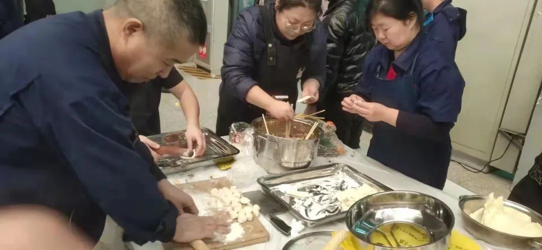 和面、拌馅、包饺子、煮饺子把活动推向了高潮,大家撸胳膊挽袖子,各显神通,一个个象征着团圆的饺子铺满了桌面,在幸福欢快的背景乐下,整个场面再次热气腾腾。
